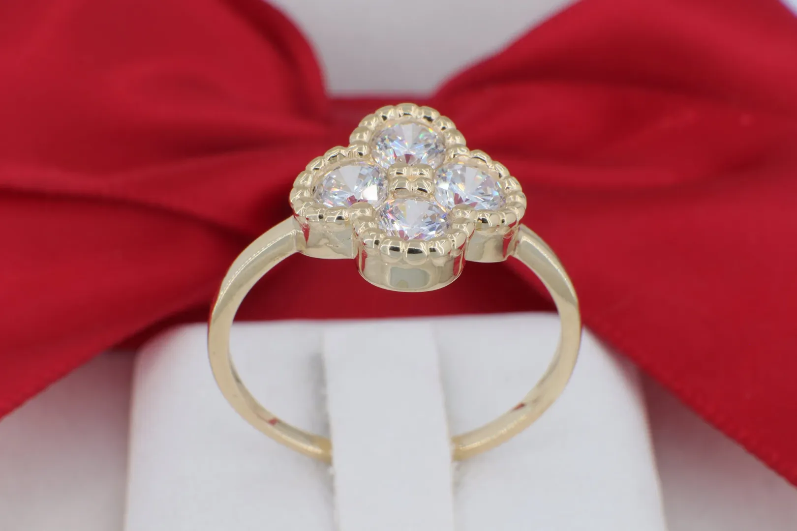 Lóhere Motívum Pavé Kövezéssel: A gyűrű központi dísze egy négylevelű lóhere, amelynek minden egyes "levelét" egy-egy nagyobb, briliáns csiszolású cirkónia kő alkotja.