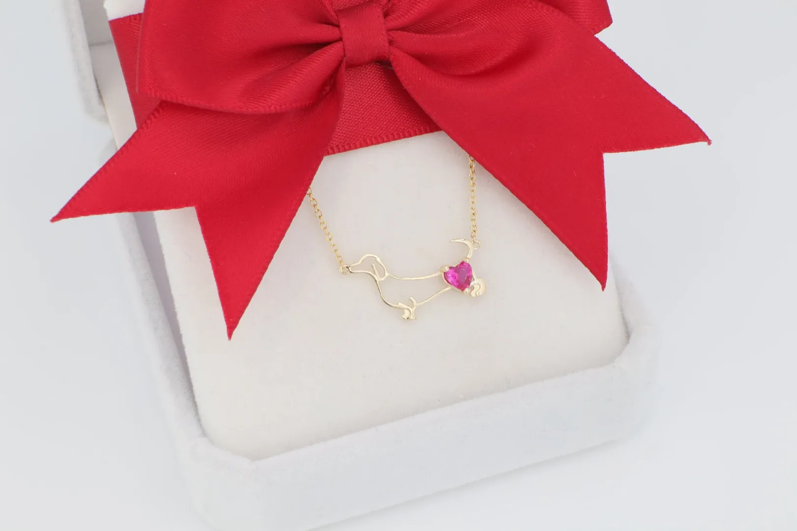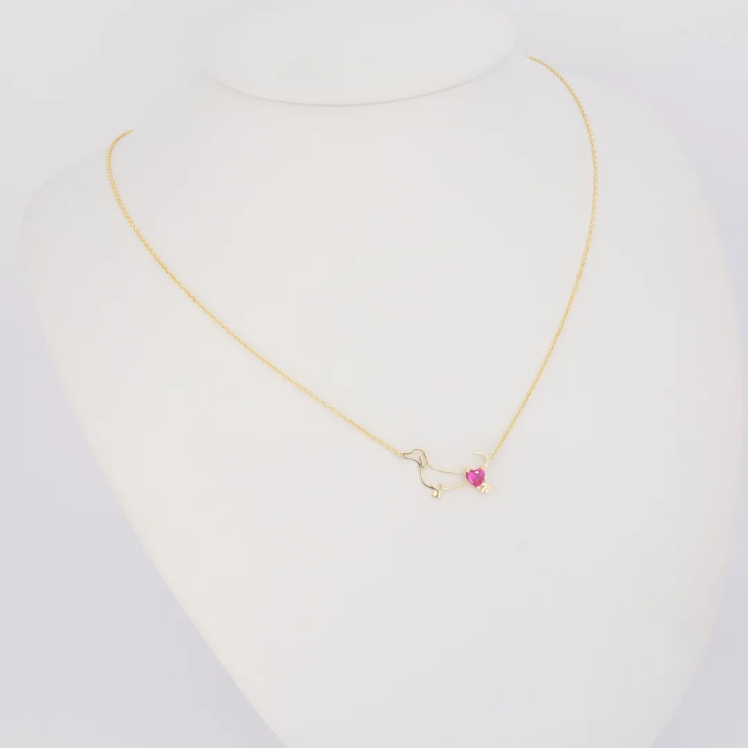 Az ékszer anyaga hitelesített 14 karátos sárga arany (585‰ finomságú), melynek vékony, polírozott lánca elegánsan keretezi a központi, szívvel díszített kutya motívumot. A fém tiszta, körvonalas megmunkálása és az élénkpiros szív kontrasztja teszi ezt a nyakláncot azonnal felismerhetővé és szívmelengetővé.