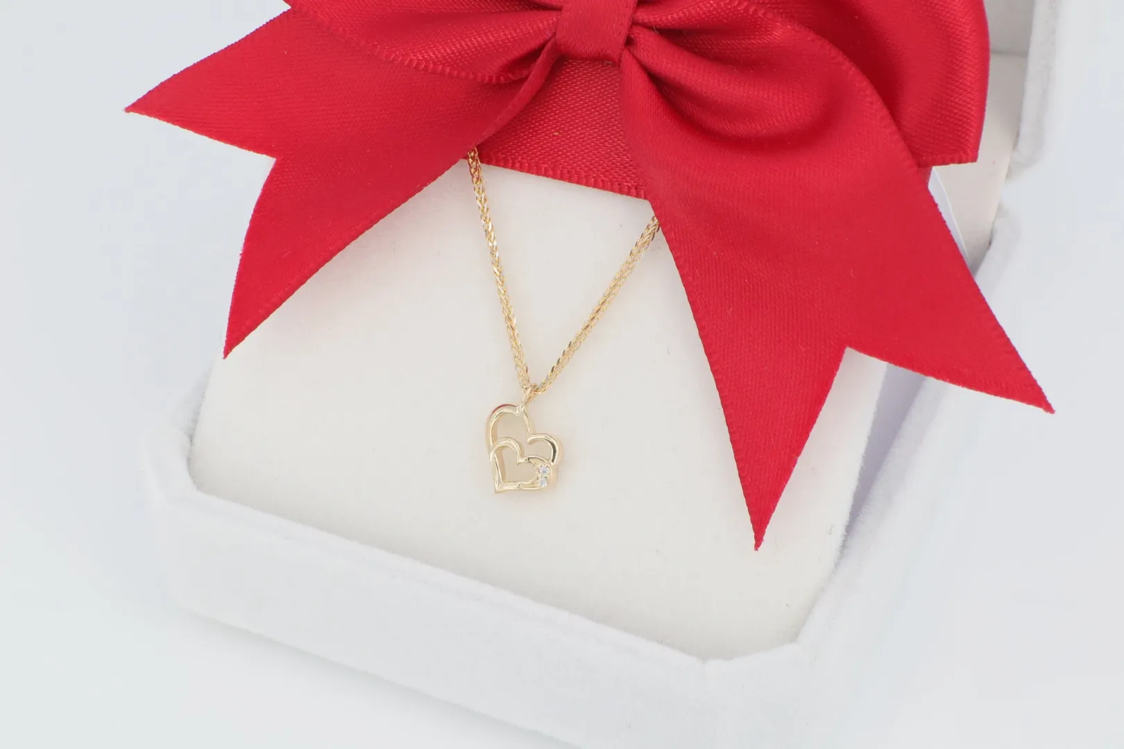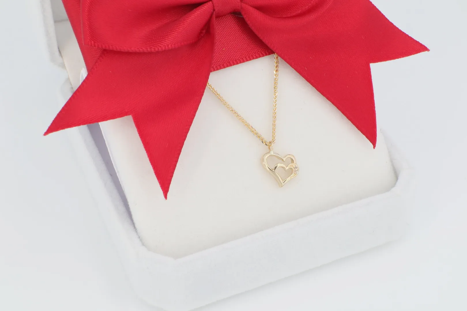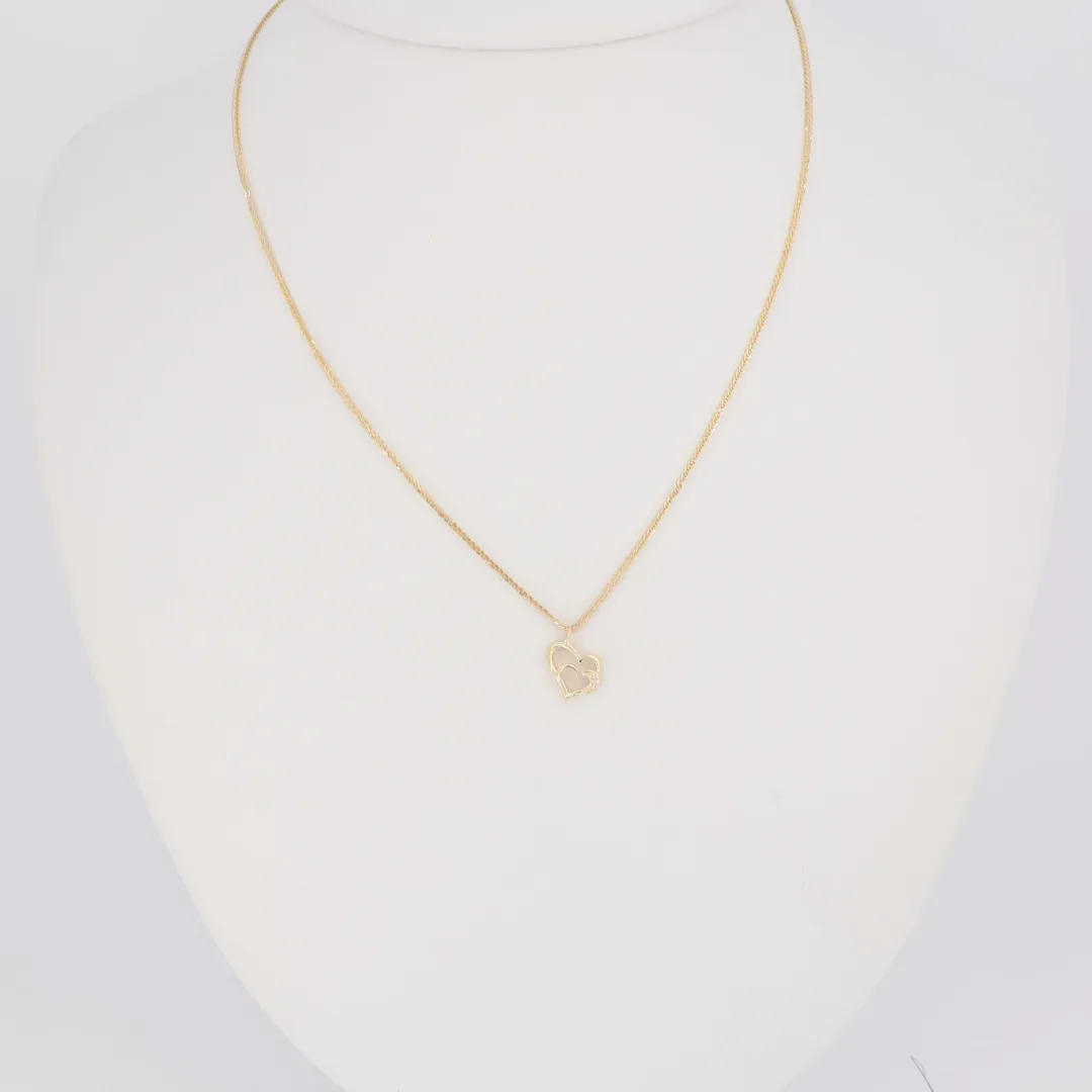 14 karátos sárga arany nyaklánc, szív a szívben arany medállal, és két apró csillogó cirkónia kővel díszítve