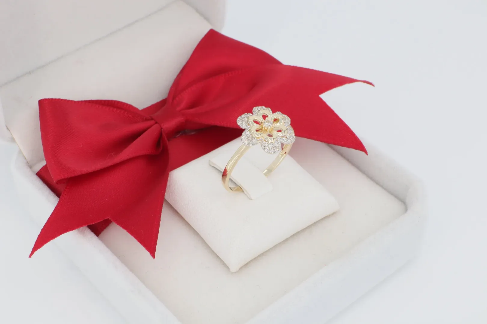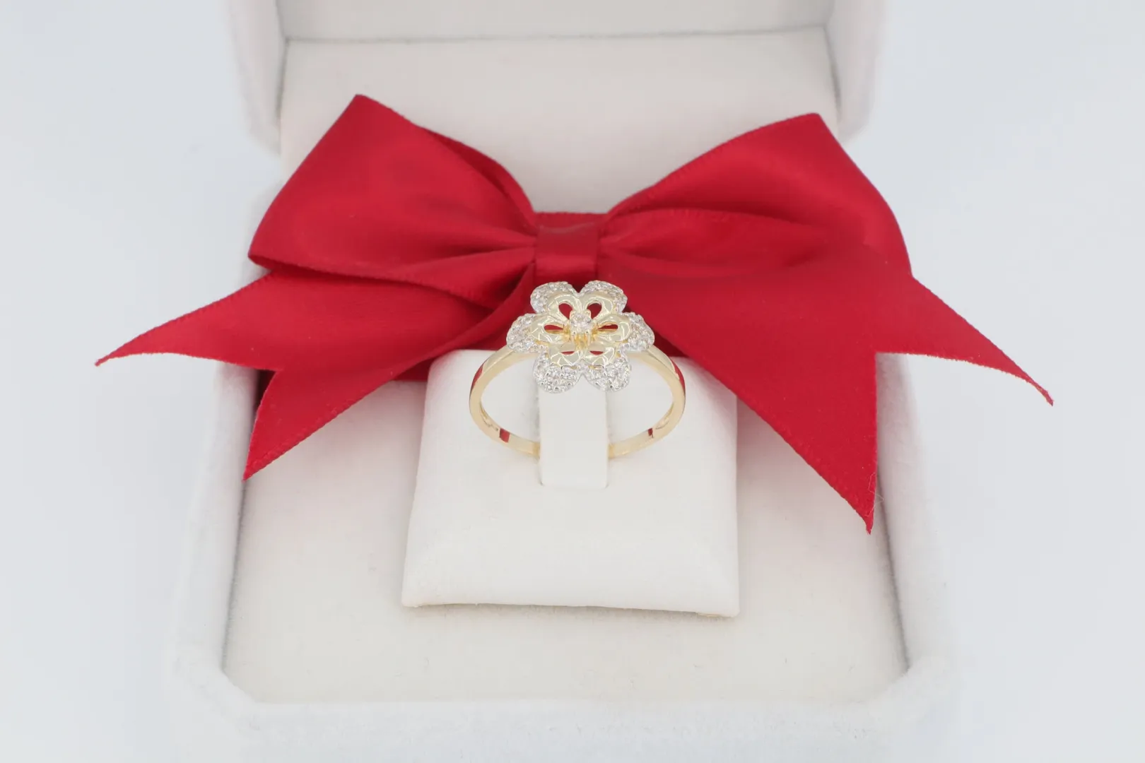 A természet bájos motívuma ragyogó kövekkel! Rendelje meg most ezt a 14 karátos virág formájú arany gyűrűt!