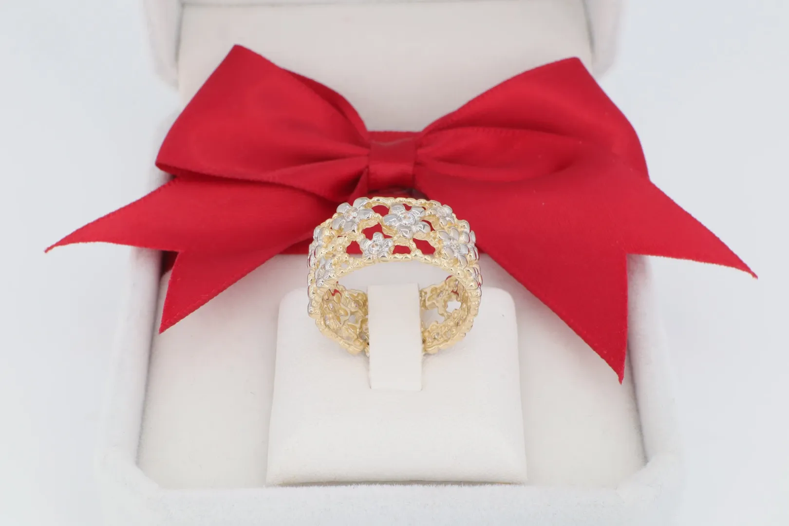 A GY0578 női arany gyűrű egy varázslatos, széles band gyűrű, amely a természet finom báját ünnepli. A design egy aprólékosan kidolgozott, áttört virágmintázatot mutat, amely légies és romantikus megjelenést kölcsönöz a darabnak. A gyűrű a meleg sárga arany alapon a virágok egyes részeit fehérarany hatású (ródiumozott) felülettel emeli ki, melyek közepén szikrázó cirkónia kövek ülnek. Ez a kétszínű arany gyűrű tökéletes választás azoknak, akik egy romantikus, virágmintás arany ékszert keresnek, amely egyszerre elegáns és feltűnő.