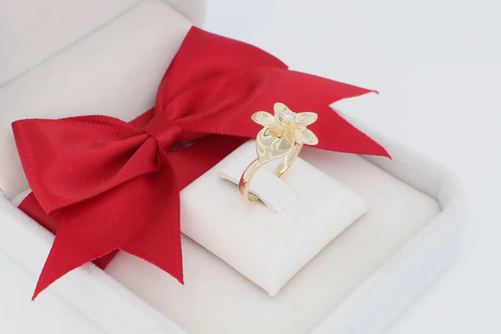 Virág Fazon: A gyűrű egyedi, virág formájú dizájnja igazi különlegesség. A virág sima, tükörfényes felülete elegáns csillogást kölcsönöz, kiemelve a sárga arany meleg, klasszikus színét.
